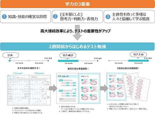 コクヨでは、こうした背景から「学力の3要素」と「テスト対策」に注目。特に「テスト前2週間」をキーワードに、自律的な「計画」「弱点確認」「弱点克服」をサポートするアイテムを提供しています。